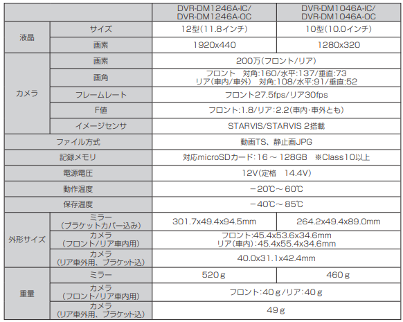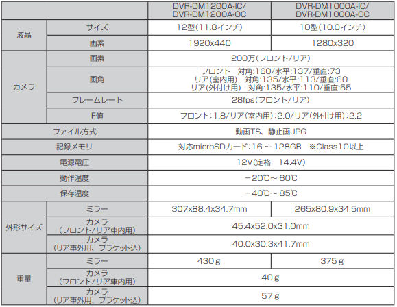 ■新型デジタルミラーの仕様表