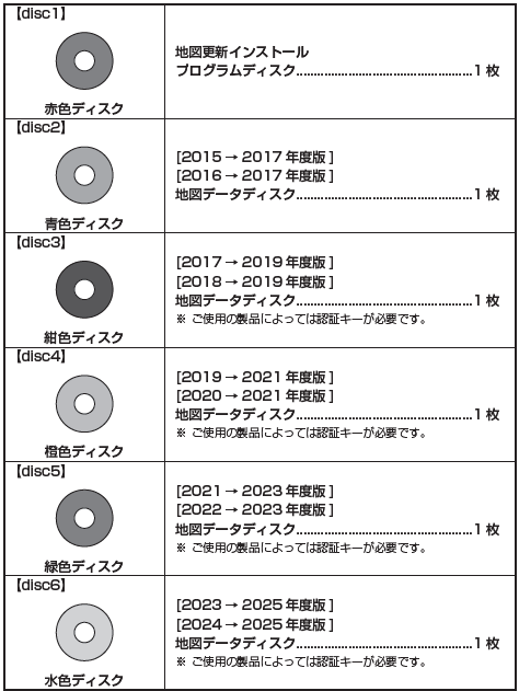 2025年版全国地図データ更新キット「HCE-E109A(有償版)」には、合計6枚のディスクが付属しております。