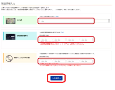 メモした[①モデル名]をプルダウンから選択し、地図更新管理番号および地図ディスクシリアル番号を入力してください。