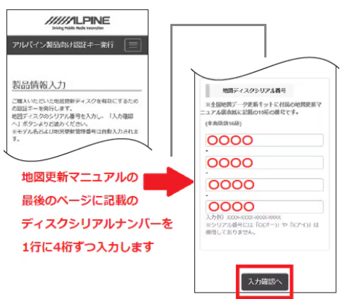専用サイトが表示されたら、画面を下にスクロールし、「地図ディスクシリアル番号」入力欄に、本書裏表紙に記載されている16桁のシリアル番号を入力してください。