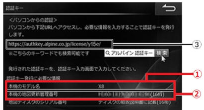 地図ディスクシリアル番号に誤りがなければ、「認証キー発行」を選択してください。16桁の認証キーが発行されます。