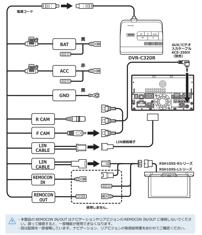 DVR-C320Rとナビゲーション、リアビジョンの接続は「LINケーブル」でおこないます。